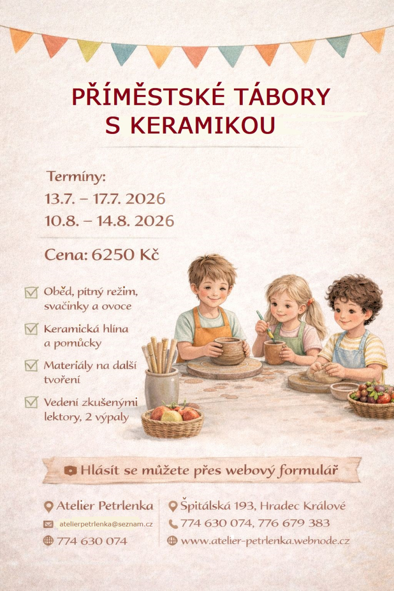 Keramický příměstský tábor v centru Hradce Králové pro všechny děti, které rády tvoří nejen z keramické hlíny a rády si hrají. Tábor se koná v komorním počtu dětí a tudíž máme možnost se při tvorbě věnovat opravdu každému. Letos pořádáme dva turnusy. V červenci a srpnu. Hlaste se včas! Míst je opravdu málo!