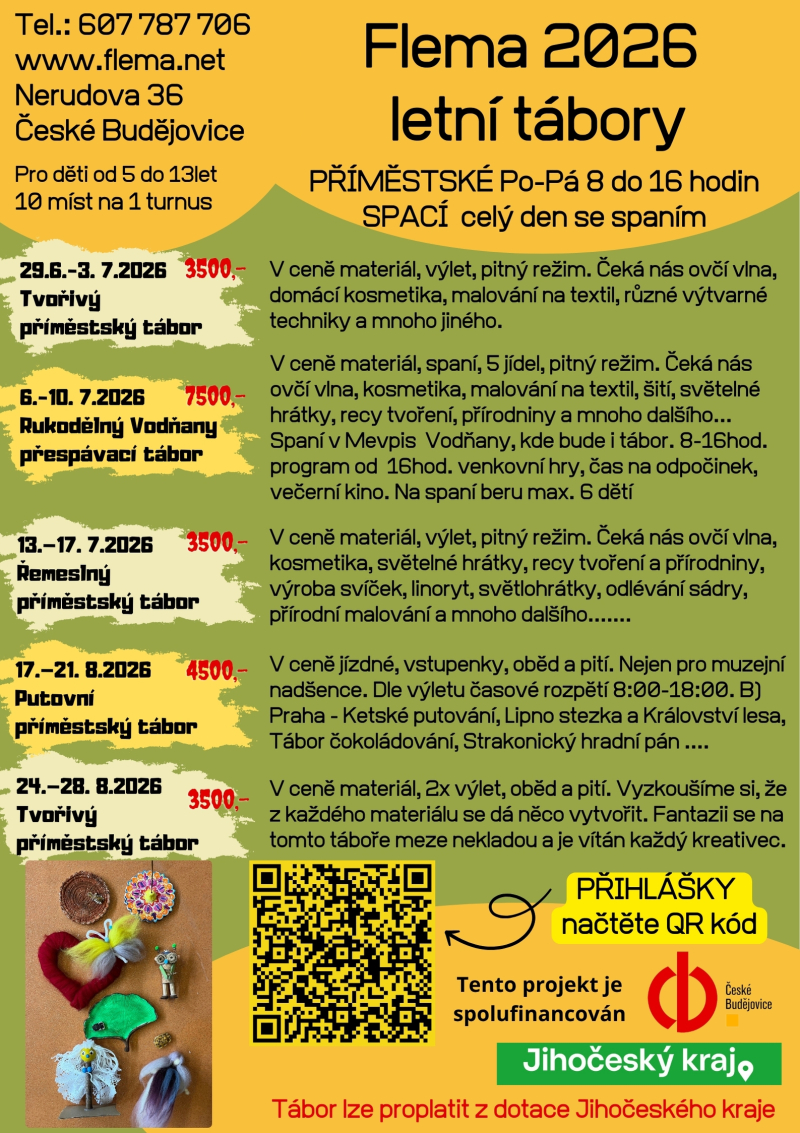 V ceně materiál, spaní, 5 jídel, pitný režim. Čeká nás ovčí vlna, kosmetika, malování na textil, šití, světelné hrátky, recy tvoření, přírodniny a mnoho dalšího... Spaní v Mevpis Vodňany, kde bude i tábor. 8-16hod. program od 16hod. venkovní hry, čas na odpočinek, večerní kino. Na spaní beru max. 6 dětí