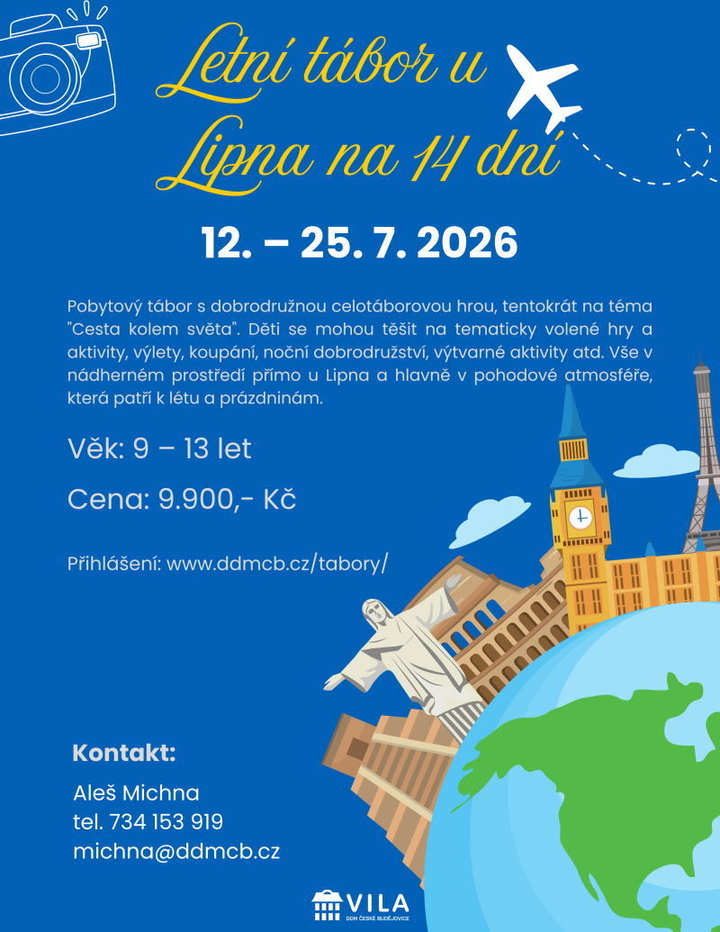 Letní tábor s dobrodružnou celotáborovou hrou, tentokrát na téma "Cesta kolem světa". Děti (ve věku od 9 do 13 let) se mohou těšit na: tematicky volené hry a aktivity, výlety po okolí, koupání, noční dobrodružství, výtvarné aktivity atd. Vše v nádherném prostředí u Lipna a hlavně v příjemné pohodové atmosféře, která patří k létu a prázdninám. Cena zahrnuje: všechny náklady tzn. strava, ubytování na naší táborové základně, materiál, doprava, vstupné, ceny, pedagogické vedení, atd.